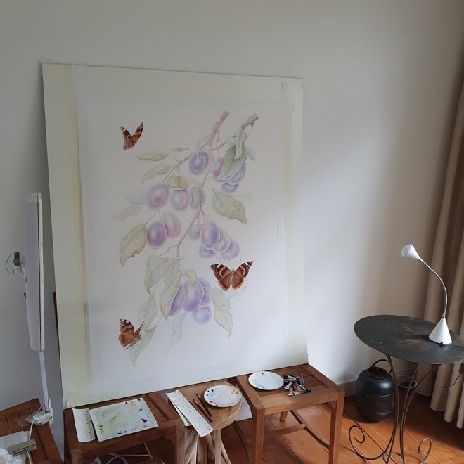 Merels scharrelen vaak op de grond op zoek naar voedsel. Ook fruit staat op het menu. Deze aquarel gaat over een merel familie, een vader, moeder en twee jongen, ze eten van afgevallen pruimen. De jongen worden maar kort gevoerd. Ze moeten nog veel leren, maar al snel zijn ze zelfstandig.