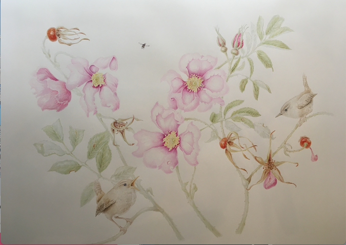 Winterkoninkjes in wilde rozen - (90 x 65 cm) / Wrens in wild roses